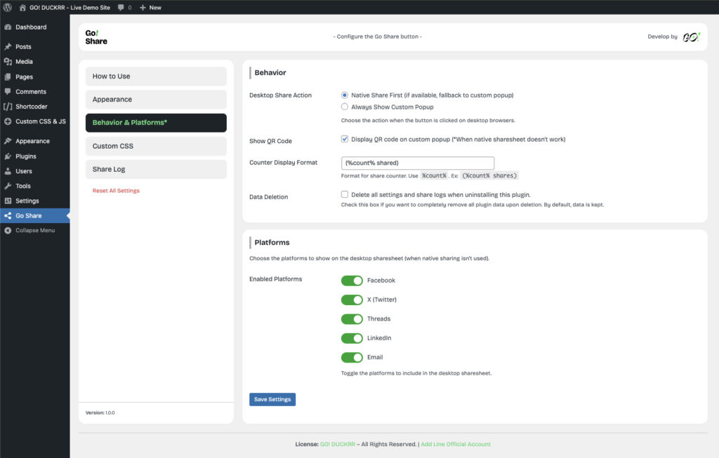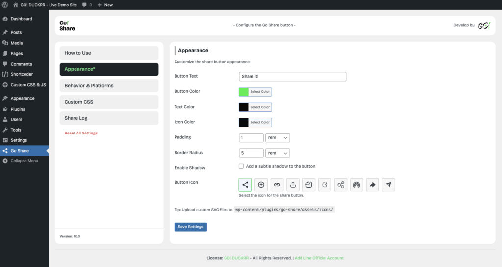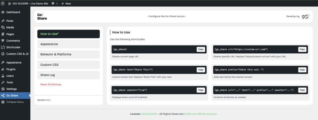 ที่นี่คุณจะได้เห็นปุ่มแชร์ Go Share ในรูปแบบต่างๆ และสามารถลองคลิกเพื่อดูการทำงานจริงได้เลย!